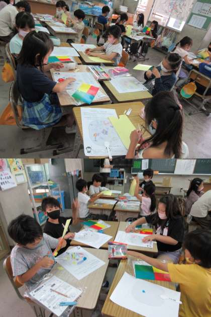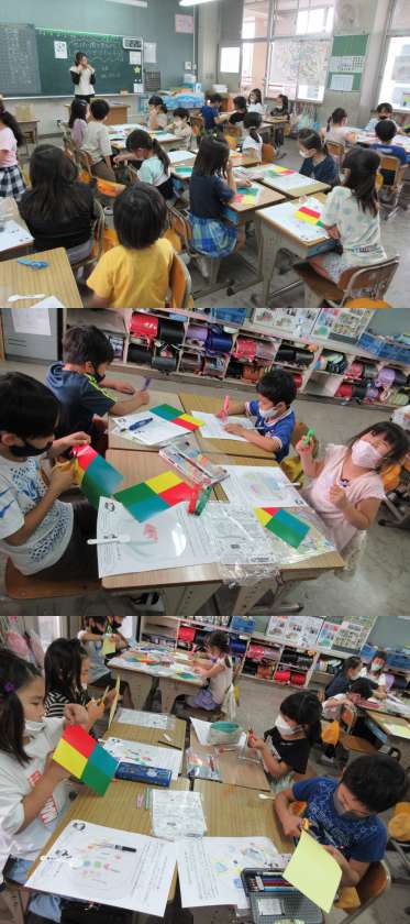 光を通していろんな形や色がゆかにうつし出されます。どんなふしぎなうちわが完成するか楽しみですね。