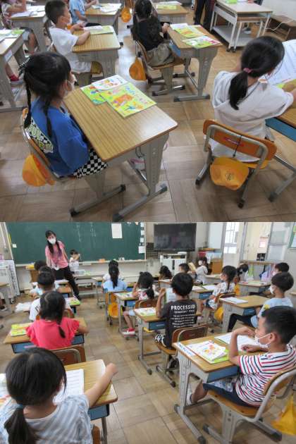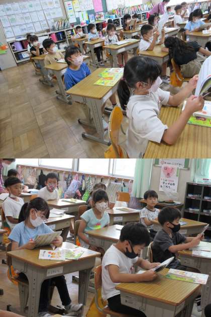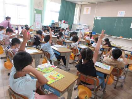 教室から,校歌を歌う元気な声が聴こえてきました。2組のおんがくの授業です。