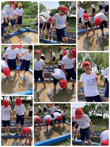 5年生は,学校で作った田んぼに苗を植えました。