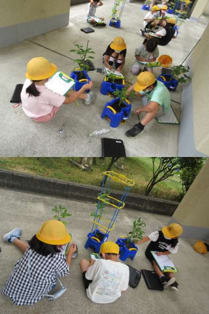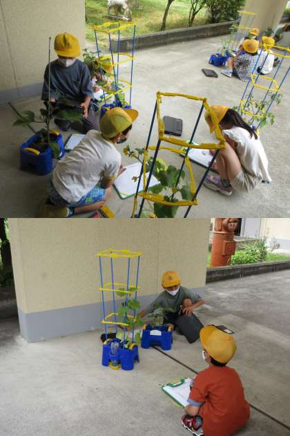 「見つけたよカード」にミニトマトやきゅうりの観察記録を記入している3組の子どもたちです。文章と絵で上手に表現していました。