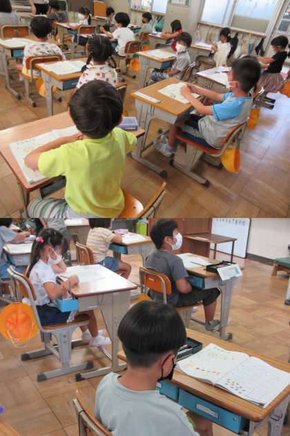 たしざん,ひきざんのさんすう復習問題にチャレンジしている3組の子どもたちです。