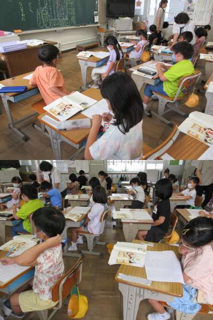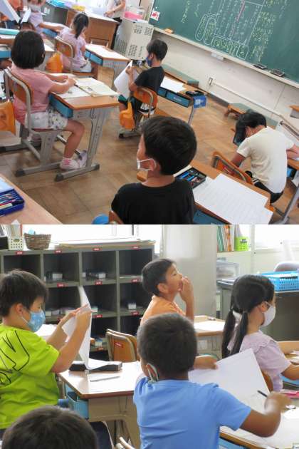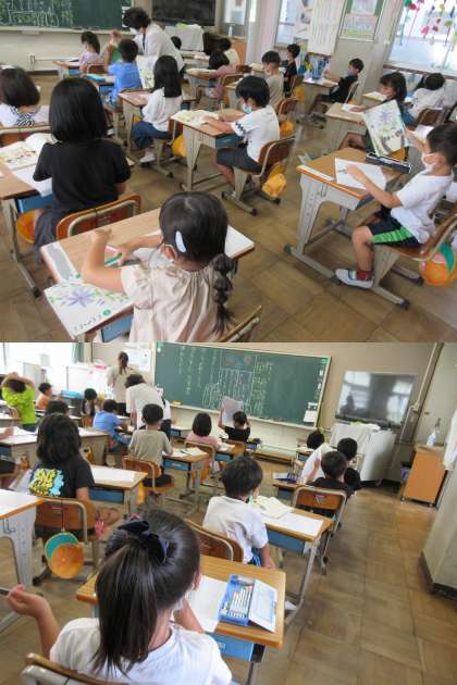 7月13日(水)1年生 公開日 2022/07/13 更新日 2022/07/13 1年 「こんなことがあったよ」という題で日記を書く学習です。 いつ,だれと,どこへ,なにをした,なにをみた,そして,おもったことを忘れずに書けたかな。写真は1組です。