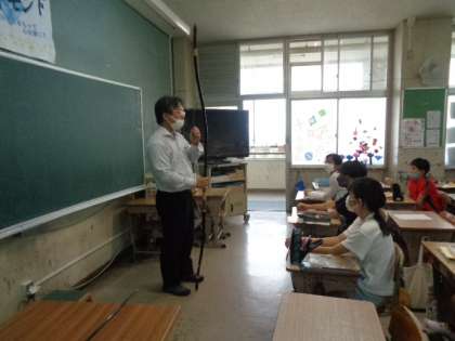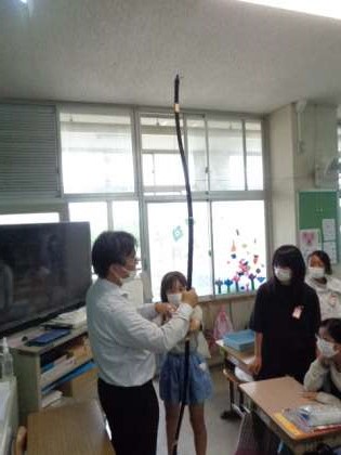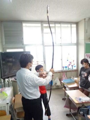 今日は6年生の先生が持っている弓を実際に触らせていただきました。