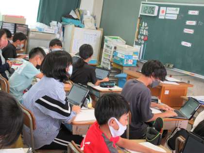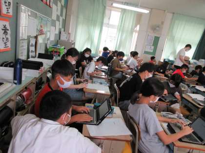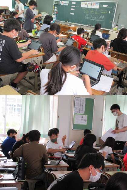 外国語の授業,1組の様子です。 「My Summer Vacation』では英語での日付の書き方も学びました。