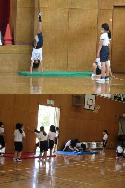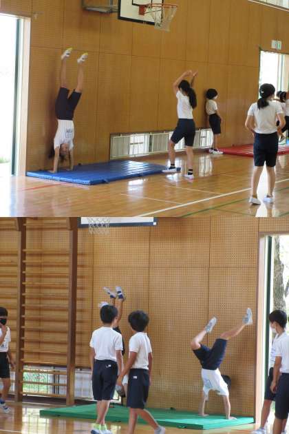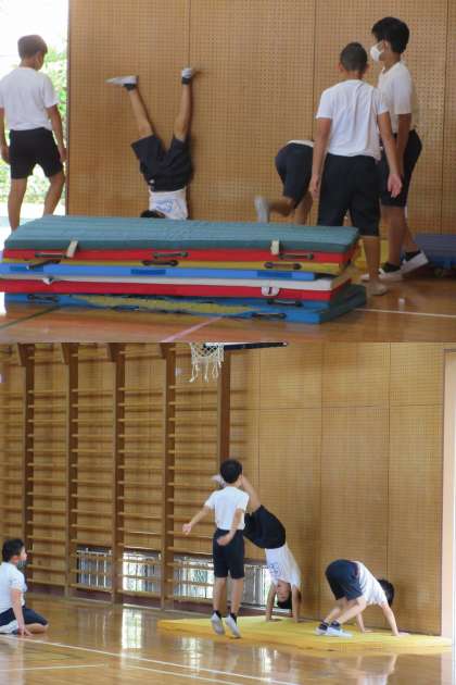 1組の体育の時間は体育館でした。 グループごでと補助し合いながら協力し,壁倒立にチャレンジです。