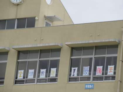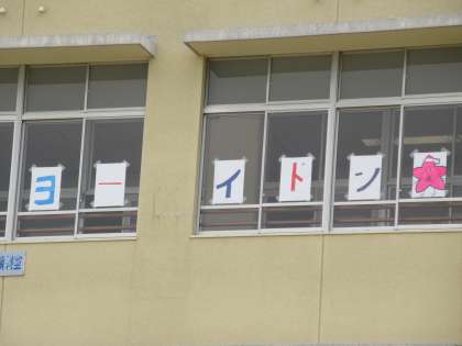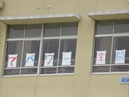 10月6日(木)体育参観スローガン 公開日 2022/10/06 更新日 2022/10/06 児童会 先日のテレビ朝会で紹介があった体育参観のスローガン「全速前進!最後までパワー全開 ヨーイドン」を代表委員の児童が校舎4階の窓に掲示してくれました。