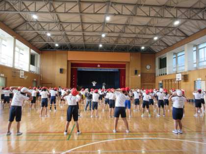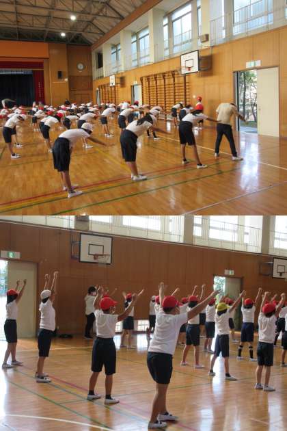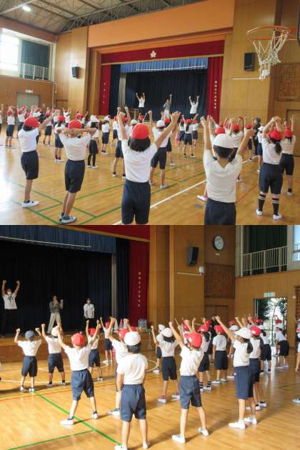 10月11日(火)3・4年生合同練習 公開日 2022/10/11 更新日 2022/10/11 4年 体育参観に向けて,3年生と4年生が体育館に集まり団体演技の練習を行っています。 舞台上の先生の動きをよく見て,楽しく一生懸命取り組んでいました。