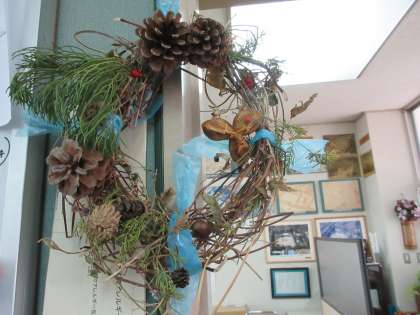 1年生が取り組んでいる「クリスマスリース作り」ですが,1年生児童が完成したものを「職員室に飾ってください」と持ってきてくれました。