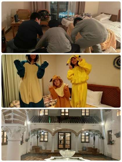 みんなパジャマに着替えて就寝準備です。可愛いパジャマもありますね。ホテルの中庭もきれいです。