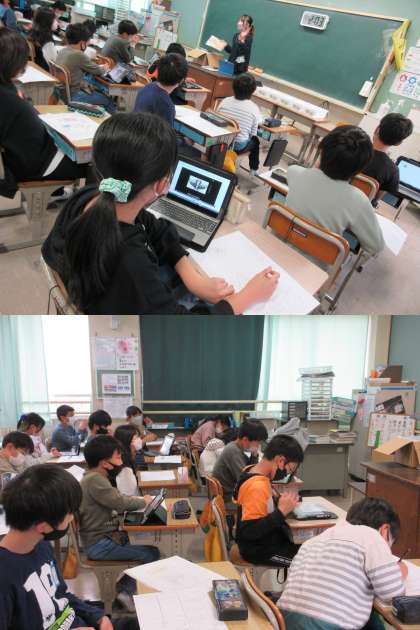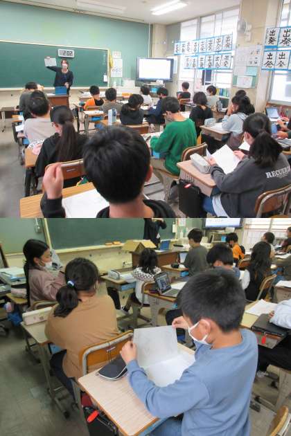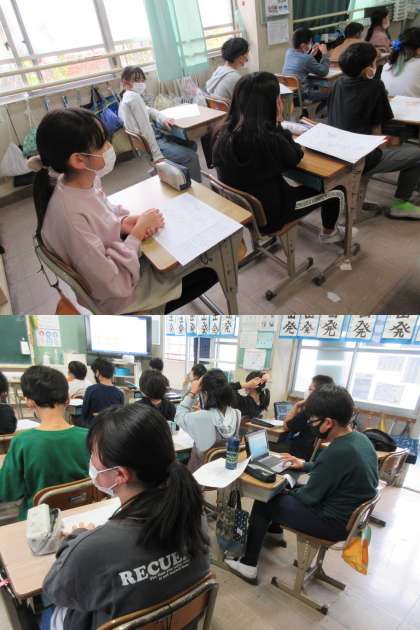 11月22日(火)5年生 公開日 2022/11/22 更新日 2022/11/22 5年 3組の図工では「糸のこデザイントレー」の制作を行っています。 描いた下絵をもとにカーボン紙を使って写していきます。 まずは担任の先生の説明をしっかり聞きました。
