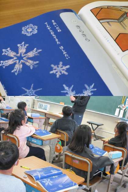 「きれいだね てんからおちてきた ほしみたい・・・」谷川俊太郎さんの言葉が美しく,雪の結晶の写真とともに幻想の世界を想像しています。3組では担任の先生の小さい頃の話も聞かせてもらいました。