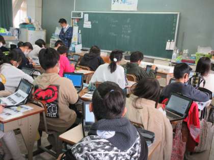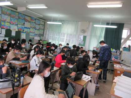 外国語の授業,1組の様子です。 タブレットを使いスポーツ選手の紹介文を書いていきます。
