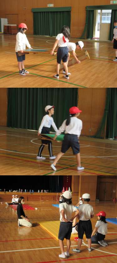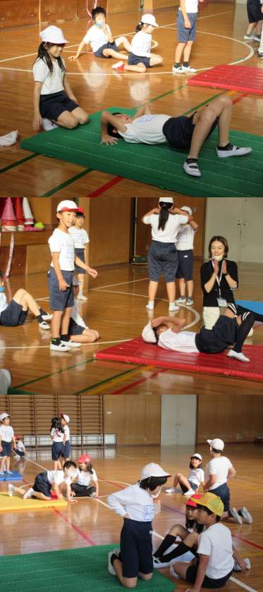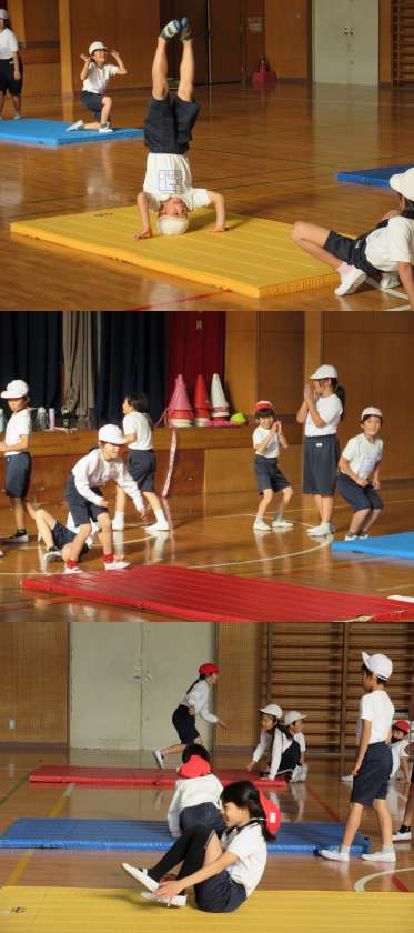 1組は体育館で感覚づくりの運動とバランス技にチャレンジしていました。