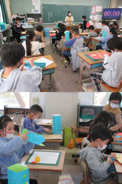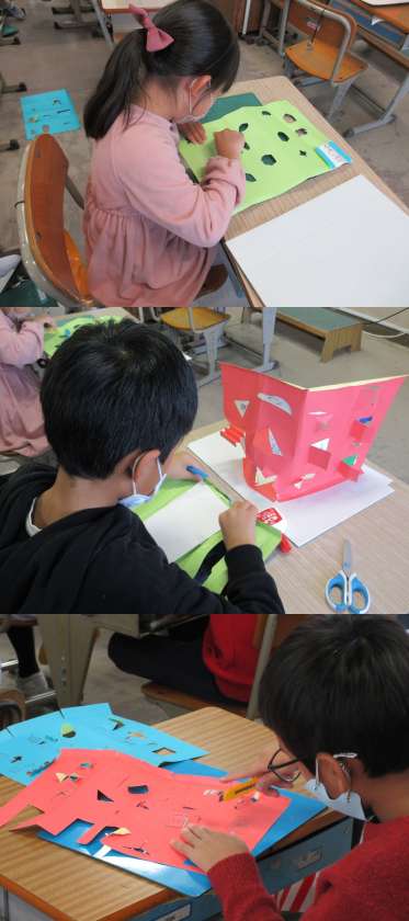 12月8日(木)2年生 公開日 2022/12/08 更新日 2022/12/08 2年 2年生の図工ではカッターナイフの正しい使い方や安全について学びます。 段ボール台紙を使って「まどのあるたてもの」を作成している2組の子どもたちです。