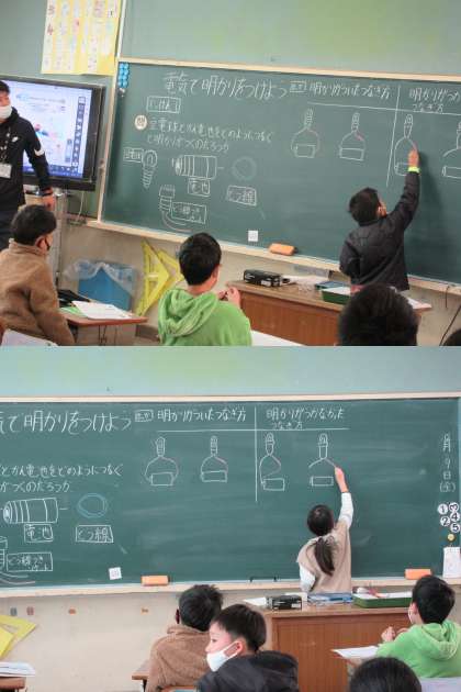 豆電球と乾電池をどのようにつなぐと明かりがつくのか実験を通して考えました。どのつなぎ方で明かりがつくのかをワークシートにまとめました。