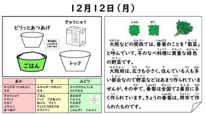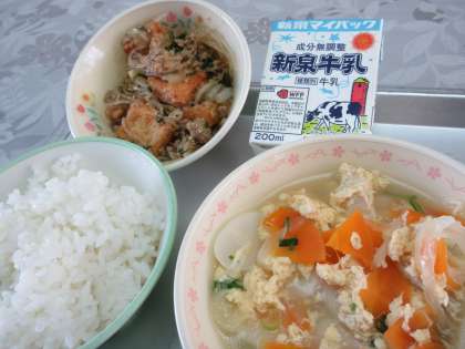 今日の給食は ・ごはん ・牛乳 ・トック ・ピリッと厚揚げ です。