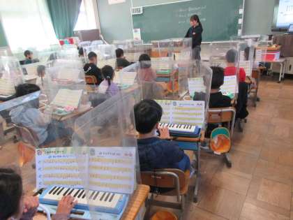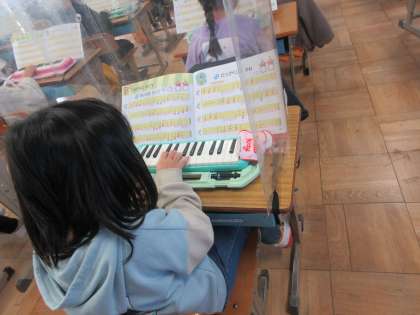 音楽の授業です。 鍵盤ハーモニカの学習をしています。 指に気をつけながら音を出しています。