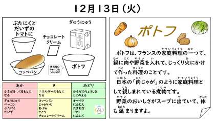 12月13日(火)今日の給食 公開日 2022/12/13 更新日 2022/12/13 給食・食教育 今日の給食は ・コッペパン ・牛乳 ・ポトフ ・豚肉と大豆のトマト煮 ・チョコレートクリーム です。