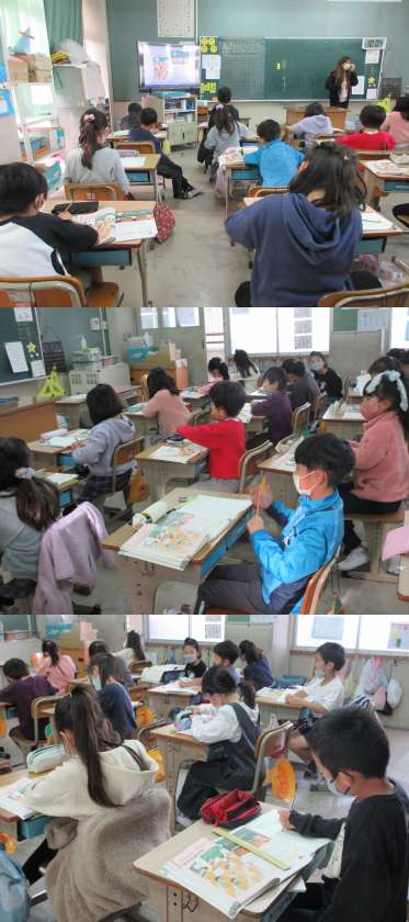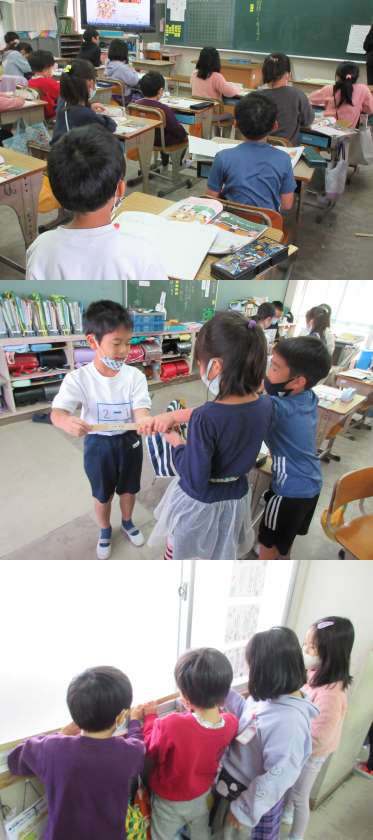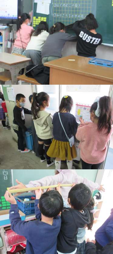 さんすうの授業,1組の様子です。30cmものさしを使って長いものの長さをはかります。教室にある黒板の横の長さや窓の長さ,担任の先生が広げた両手の長さなどを各グループごとではかりました。
