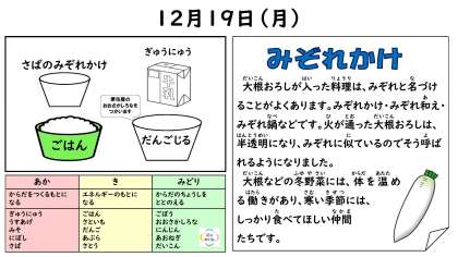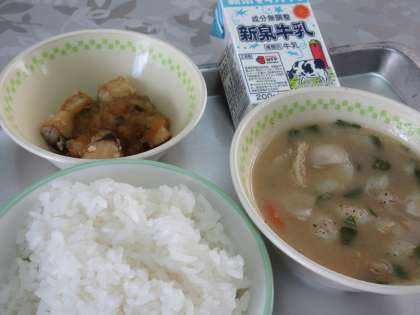 今日の給食は ・ごはん ・牛乳 ・だんご汁 ・さばのみぞれかけ です。