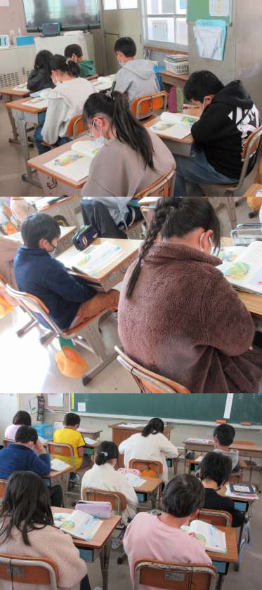 12月20日(火)3年生 公開日 2022/12/20 更新日 2022/12/20 3年 道徳の時間,1組の子どもたちです。『目の前は青空』を読み,友だちと助け合うことでどんな気持ちになるかを考えます。