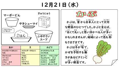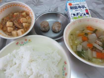 今日の給食は ・ごはん ・牛乳 ・冬野菜スープ ・麻婆丼 ・焼シューマイ です。
