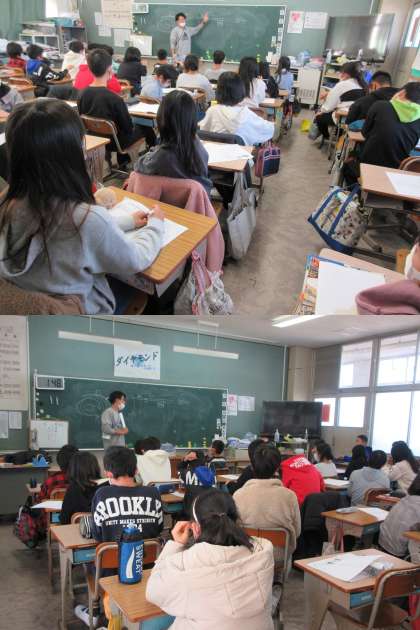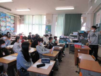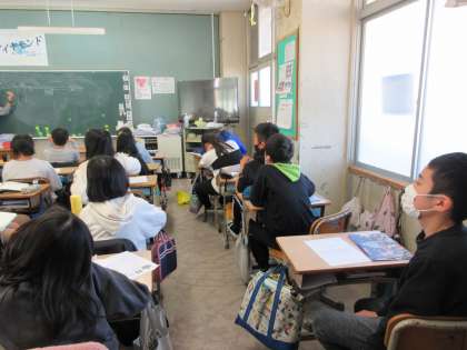 1月24日に実施される「交響楽団芸術鑑賞」について,担任の先生から説明がありました。写真は2組です。