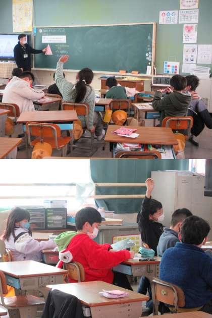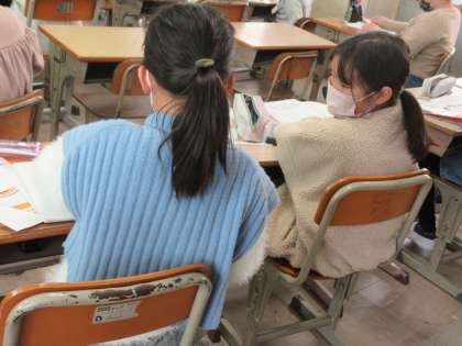 少人数の各教室に分かれて取り組んでいます。二等辺三角形を切り取り,重ねて比べ,気づいたことについて考えました。