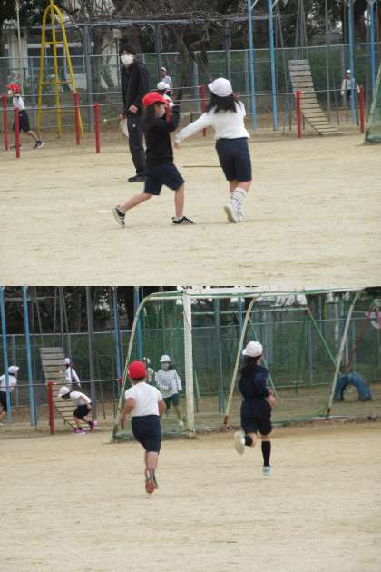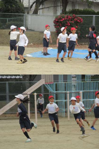 2年生,今日の体育は1組,2組,3組ともに同じ時間に運動場での活動です。 写真は3組です。