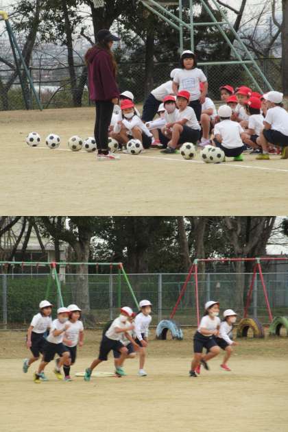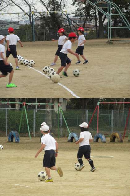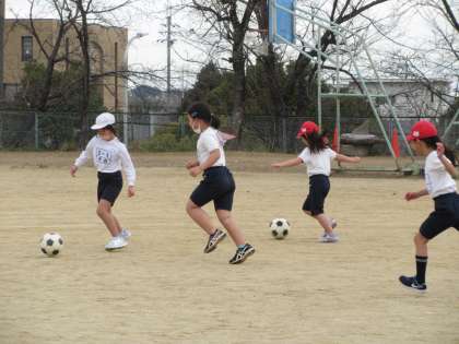 サッカーボールを上手にあつかう1組の子どもたちです。 冷たい風も吹き飛ぶくらいの元気がありました。