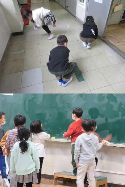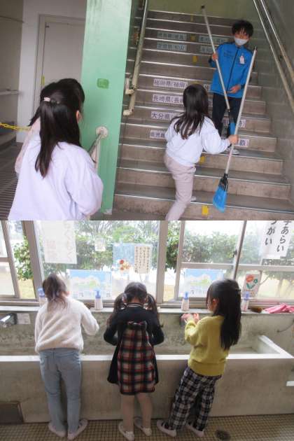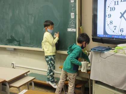 廊下の拭き掃除やぞうきんをしぼる際は水が冷たいですね。それでもがんばっている1年生です。