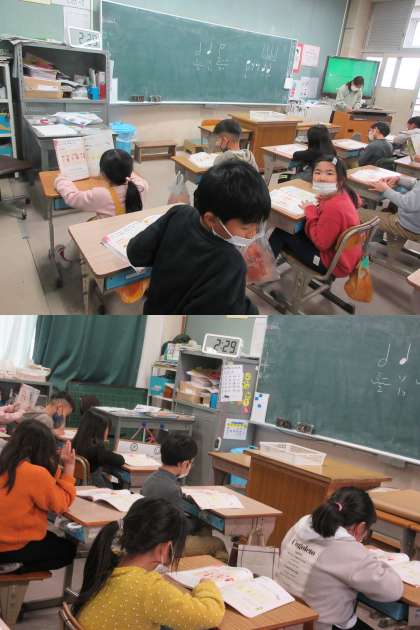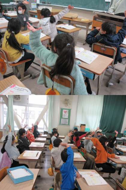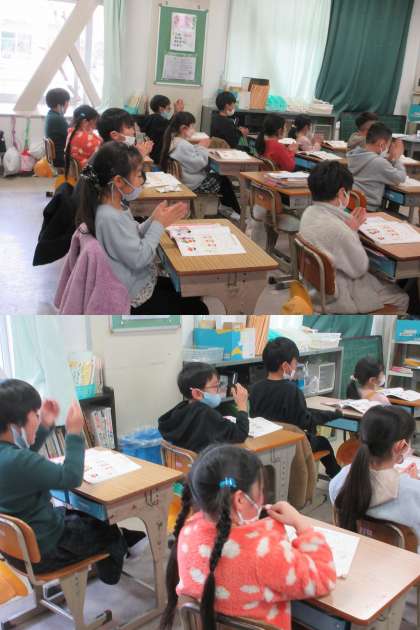 2月3日(金)2年生 公開日 2023/02/03 更新日 2023/02/03 2年 「わらべうた」で楽しむ2組の子どもたちです。♪なべ なべ そこ ぬけ♪など有名なものは「あっ、知ってる!」という声があがっていました。