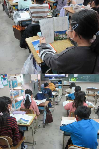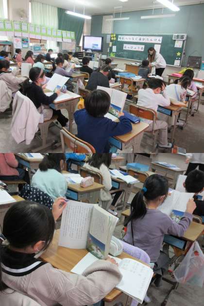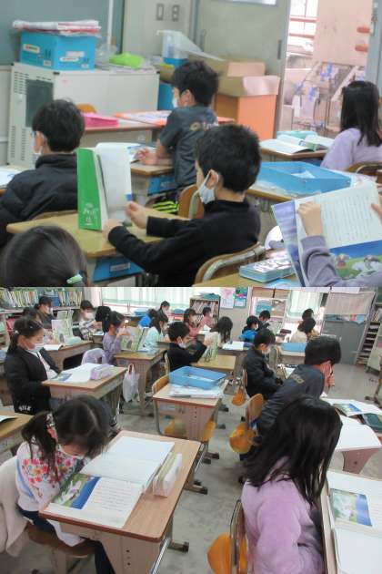 『スーホの白い馬』を姿勢よく読んでいる1組の子どもたちです。