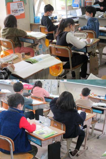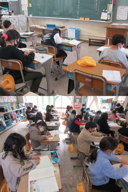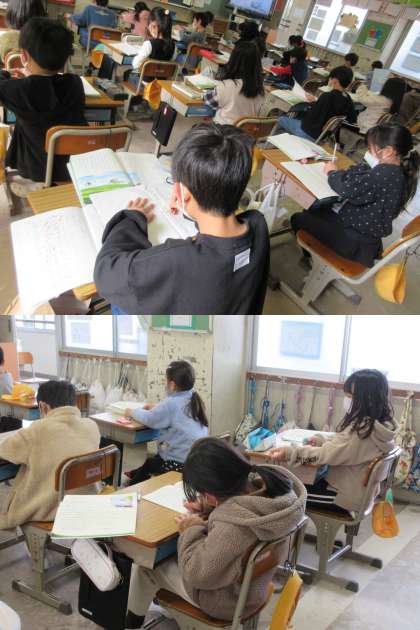 『スーホの白い馬』の第5場面のできごとをまとめている3組の子どもたちです。