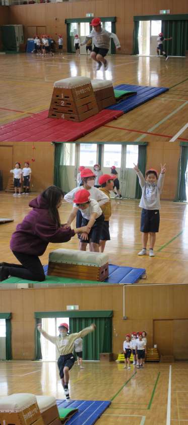 跳び箱を使って「うで車」や「ムササビ」「大ジャンプ」などの技にチャレンジしました。