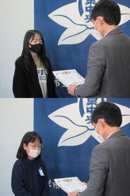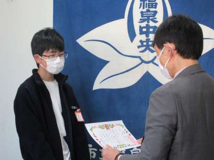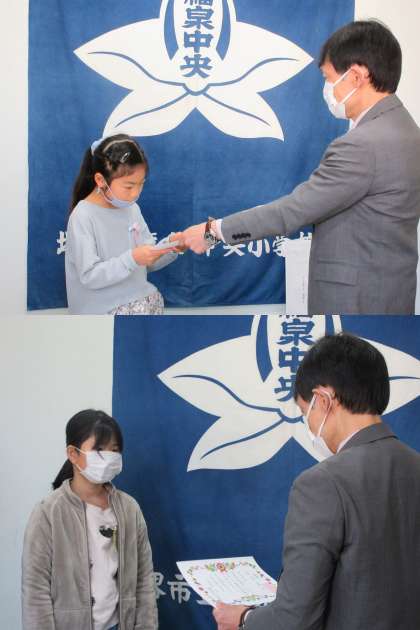 福泉中央学びンピックの表彰(金賞受賞)の様子です。 堂々と賞状を受け取ることができました。