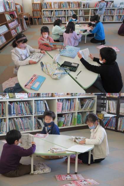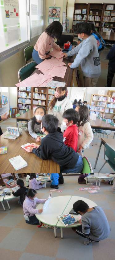 1組は図書の時間です。 各自の読書のあとは、司書の先生による読み聞かせがありました。