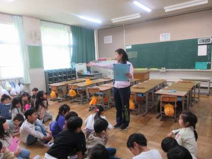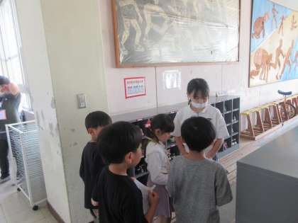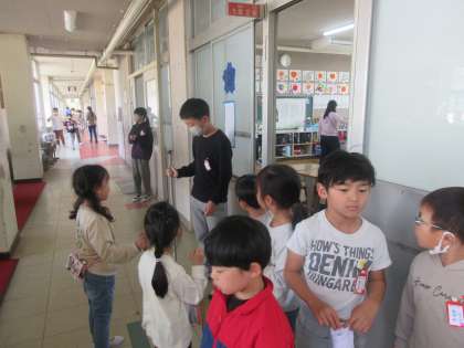 6年生のお兄さんお姉さんに手伝ってもらいながら初めての掃除をしています。