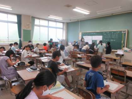4年生が少人数教室で、0.1と0.01との関係を考える学習をしていました。