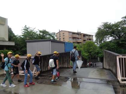 体育館で、先生の話を聞いて出発です。
