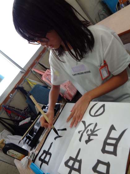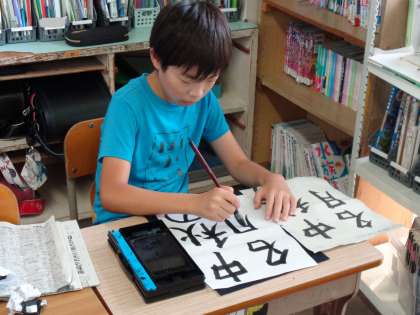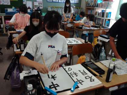 習字の授業中です。今日の字は「中秋の名月」です。小さな半紙に5文字をバランスよく入れて書くのは難しいものですが、集中して取り組めています。