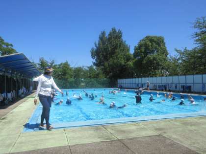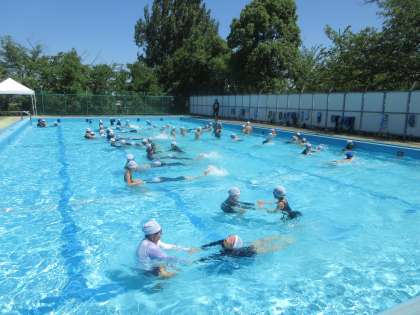 今季一番の暑さのなか、ふし浮きや蹴伸びなどの練習をしています。