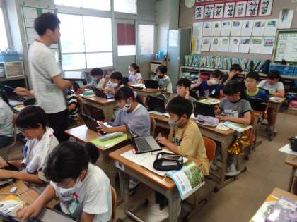 教室で学習した後、タブレットを持ち、外へ出て、観察活動に取り組んでいます。