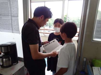 6年生の子どもたちが、休み時間を使って、たてわり活動の活動内容を、担当の先生に確認してもらっています。たてわり活動は、6年生の子どもたちの力の見せどころですね。
