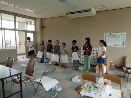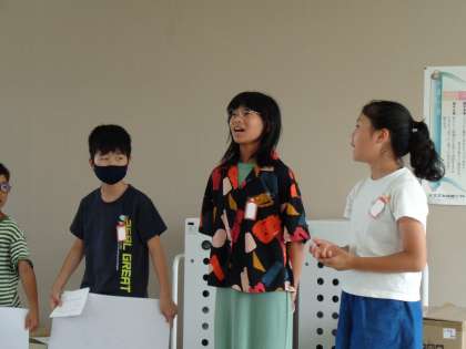 児童会の子どもたちが、終業式で発表する内容の練習をしています。