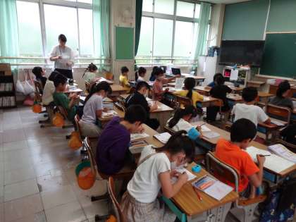 算数の授業でわり算のプリントに取り組んでいます。