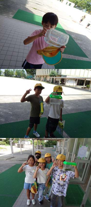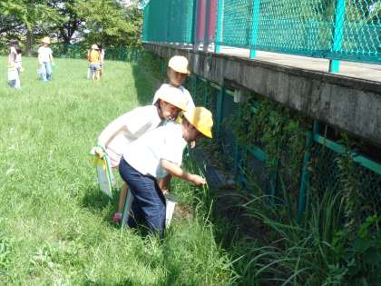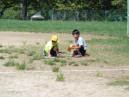 理科の授業で、運動場に出て、生き物をさがしています。バッタやちょうなどが見つかっています。そろそろ生き物にも変化が出てきそうですね。