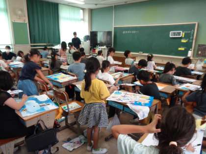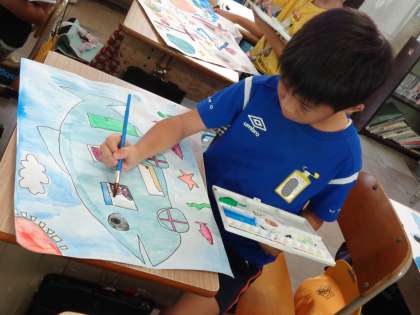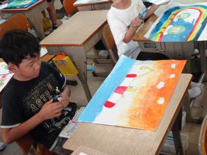 図工の作品もほぼ完成です。 最後まで、集中して仕上げました。きれいなグラデーション色の空が、本物みたいですね。
