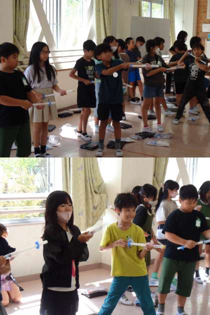 「とじこめた空気」について、空気鉄砲の玉を飛ばす実験をしながら考えています。