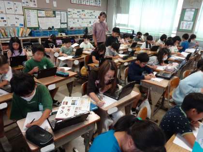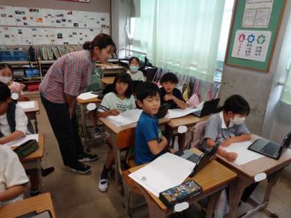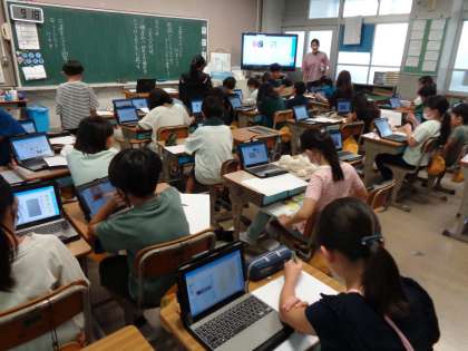 教育実習生の授業計画のため、単元を入れ替えていましたが、工芸品のリーフレット作成に取り組んでいます。